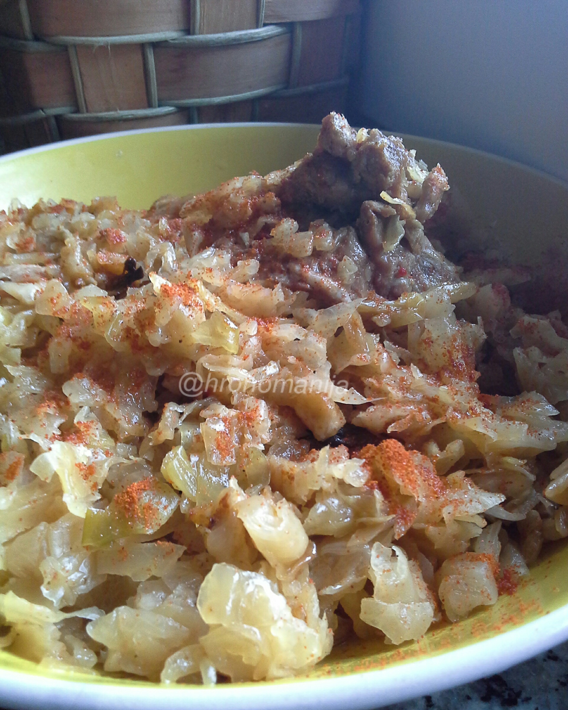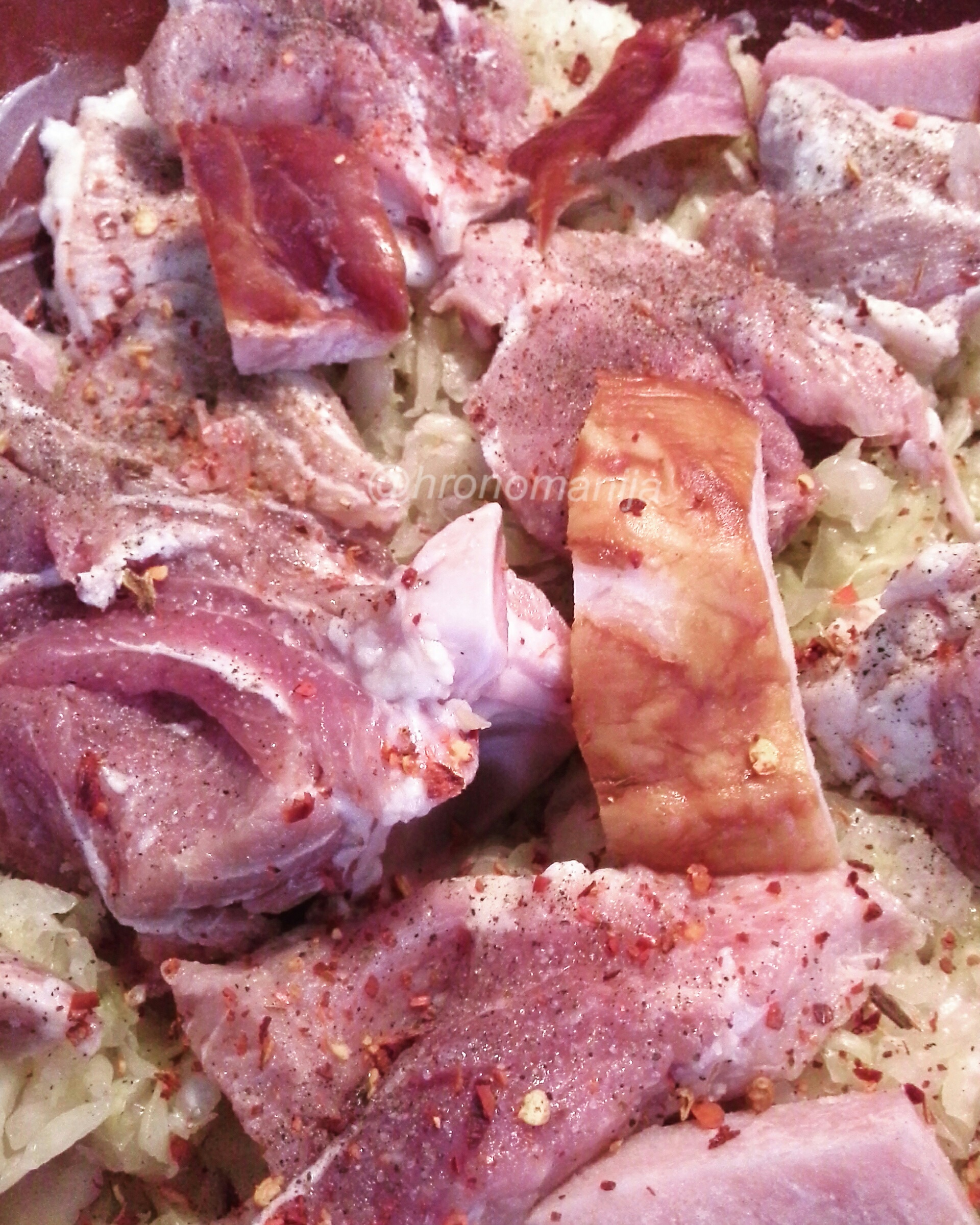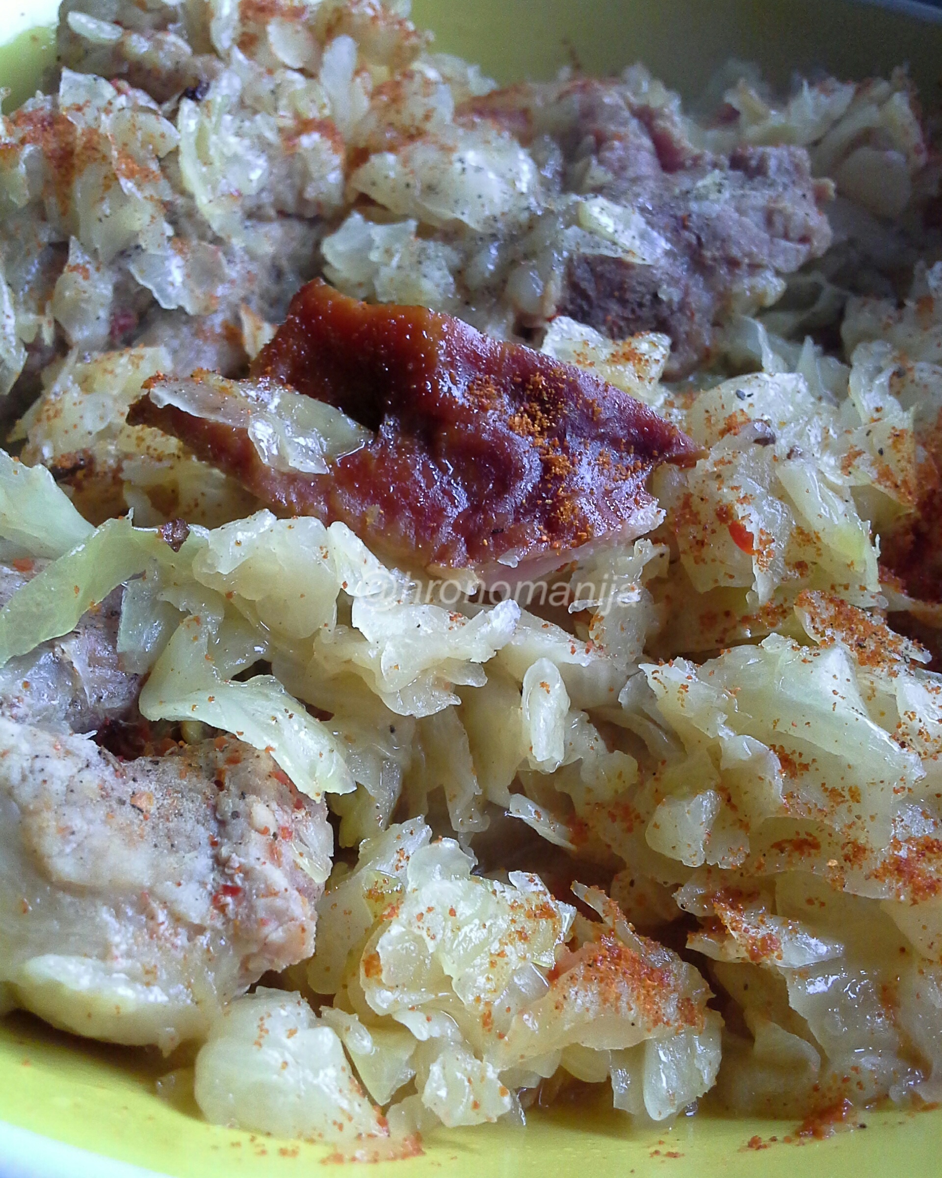 Potrebno: kupus ribanac, svinjsko meso (iseći šnicle na komade, a mogu i rebra), kim, so, biber, mlevena paprika, dimljena pečenica ili slanina, lovorov list.
