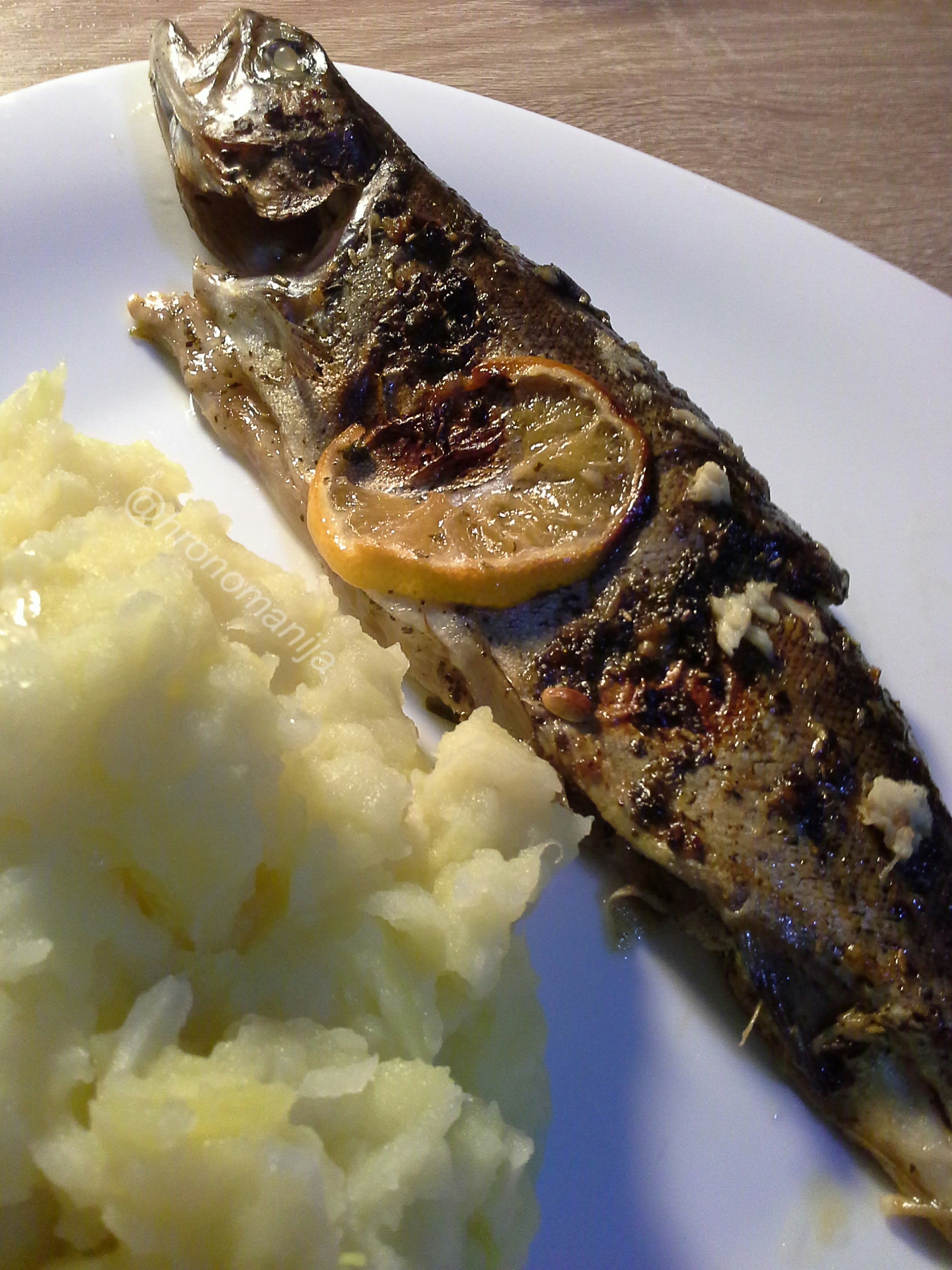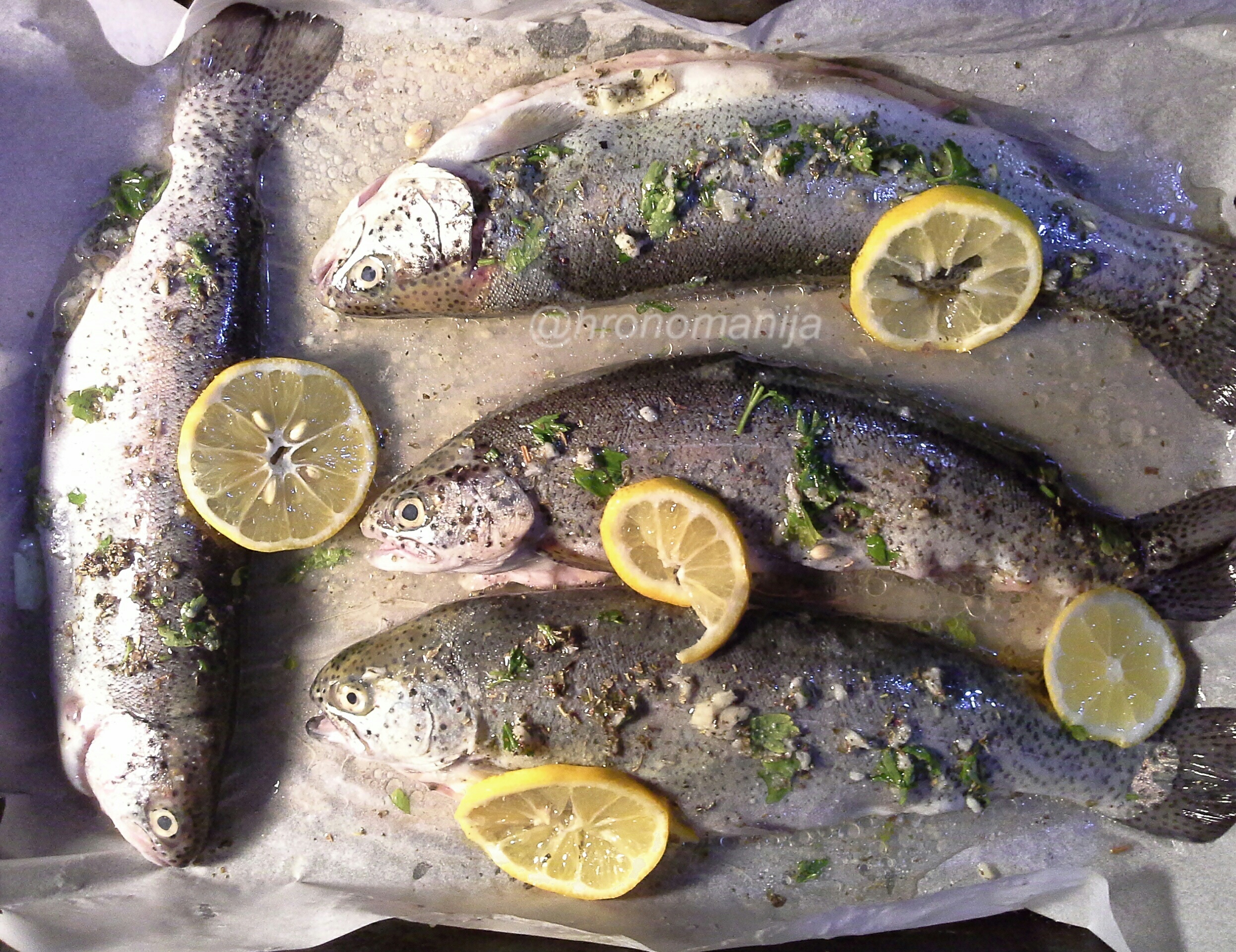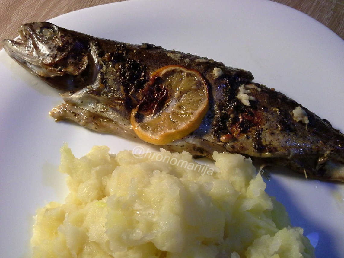 Potrebno: Pastrmka, peršun, limun, ruzmarin, so, maslinovo ulje, beli luk, a za salatu- krompir, crni luk, ulje, limun, so.