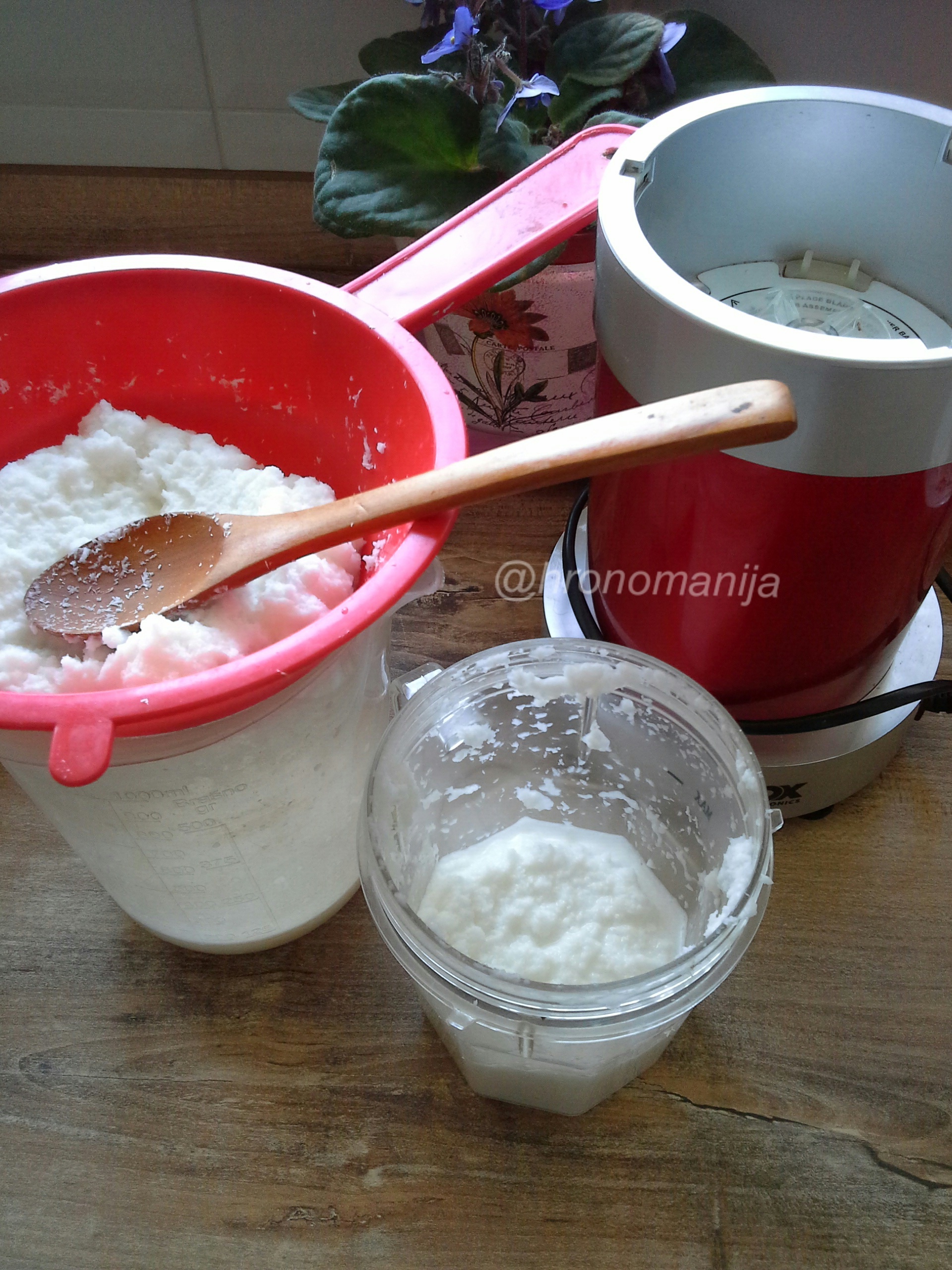 Izmeriti 50g kokosovog brašna i sipati u teglu. Zagrejati 3dl vode (skoro do ključanja), a zatim preliti vodom kokos u tegli. Promešati smesu i ostaviti da odstoji poklopljeno bar sat vremena. Prohlađenu smesu mutiti u blenderu, a potom procediti kroz cediljku dok ne izađe sva tečnost (pritiskati kašikom).