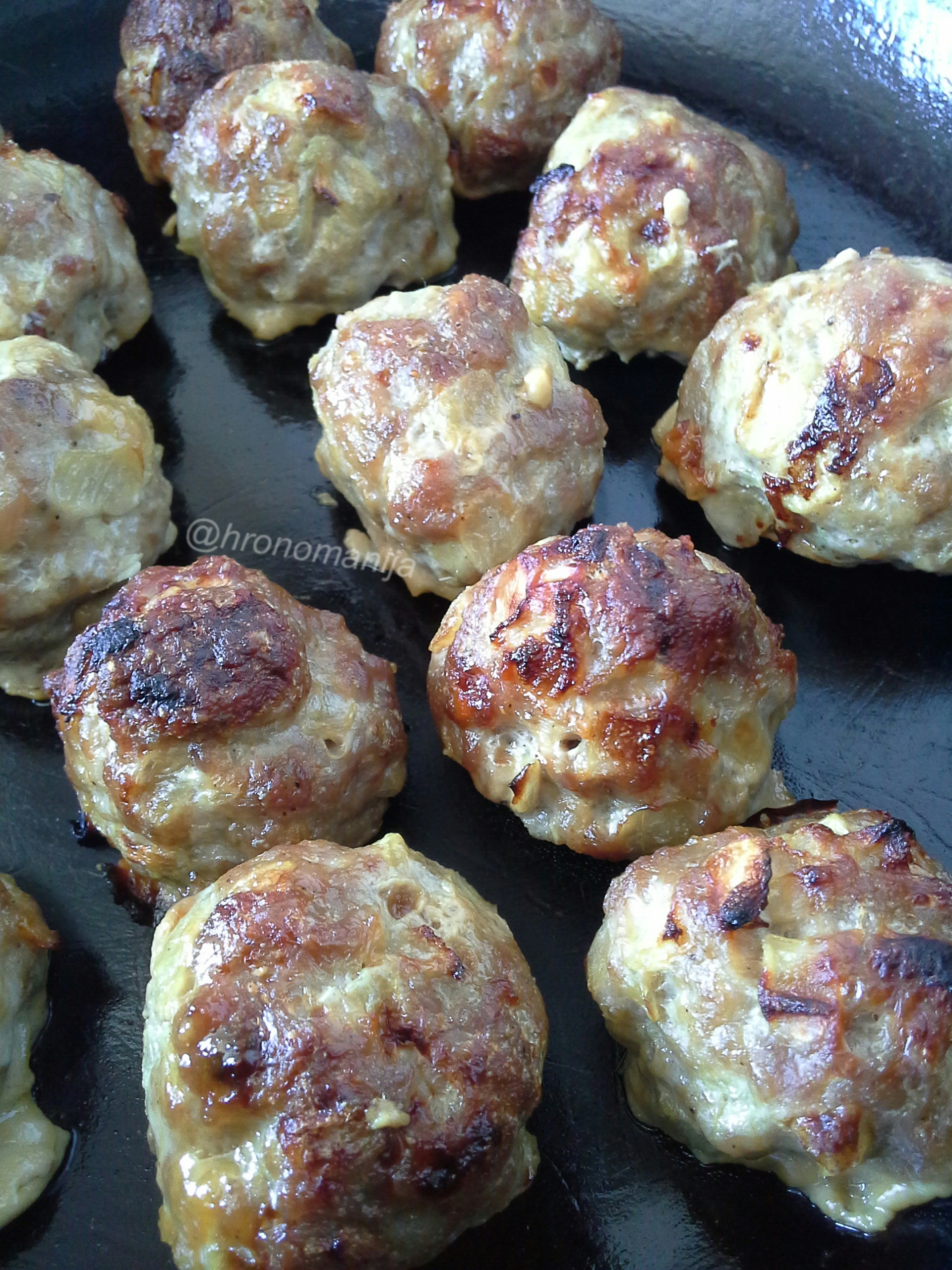 Potrebno: 500g svinjskog mesa dva puta samlevenog, glavica crnog luka, 1 belance, morska so, biber, beli luk u prahu, bosiljak. Za sos je potrebno 500ml pelata.
