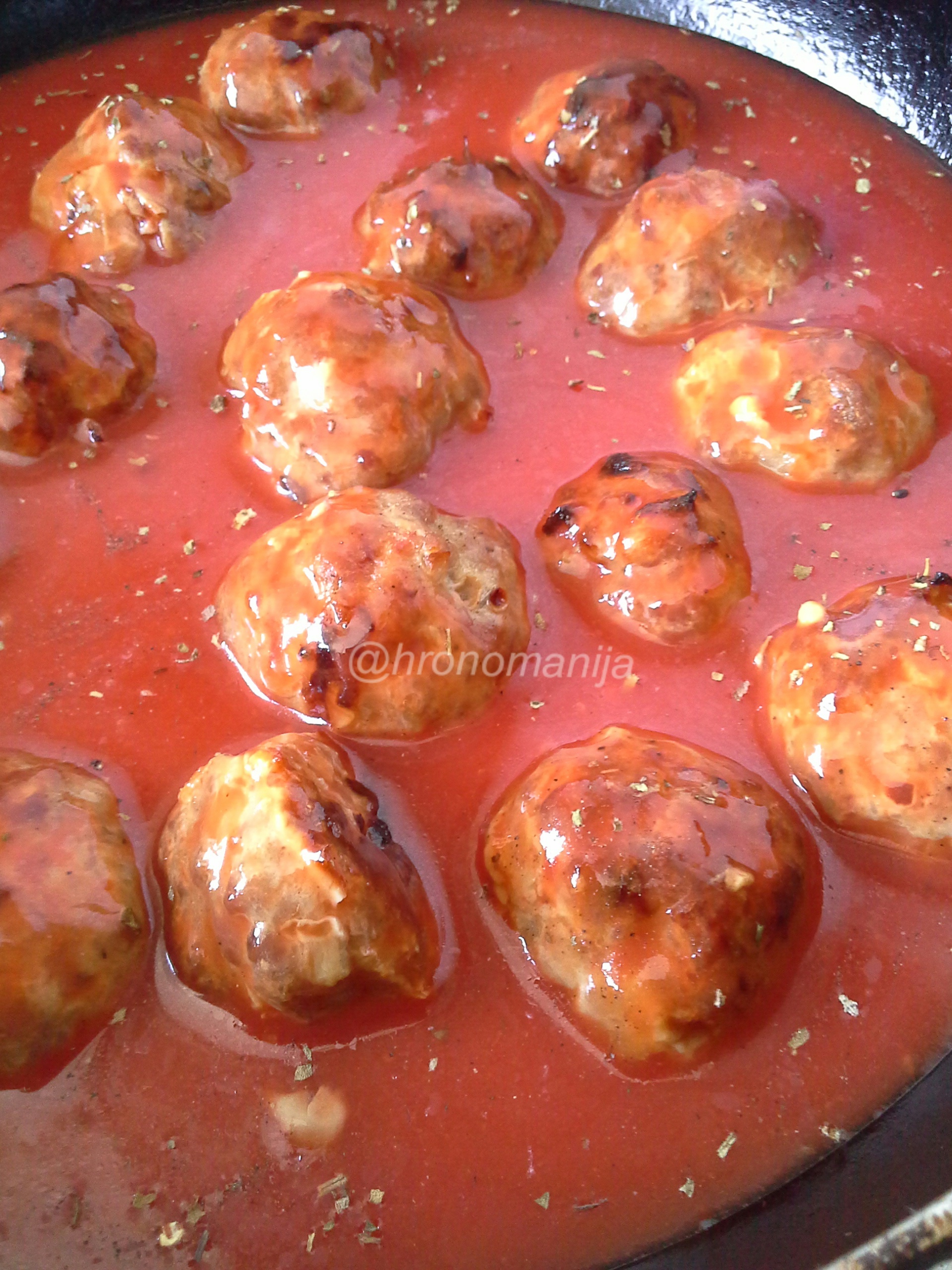 Nakon pečenja u rerni ćufte prebaciti u tiganj, dodati pelat (bez šećera) koji možete začiniti belim lukom u prahu i bosiljkom i sve zajedno kratko prokrčkati na slaboj vatri.