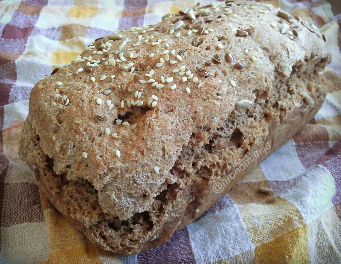 Sjediniti sve sastojke, najpre suve a onda dodati tečne. Tako formirano testo prebaciti u kalup za hleb obložen pek papirom. Odozgo možete posuti semenkama po želji. Potrebno je da testo odstoji nekih pola sata do 45minuta pre pečenja.