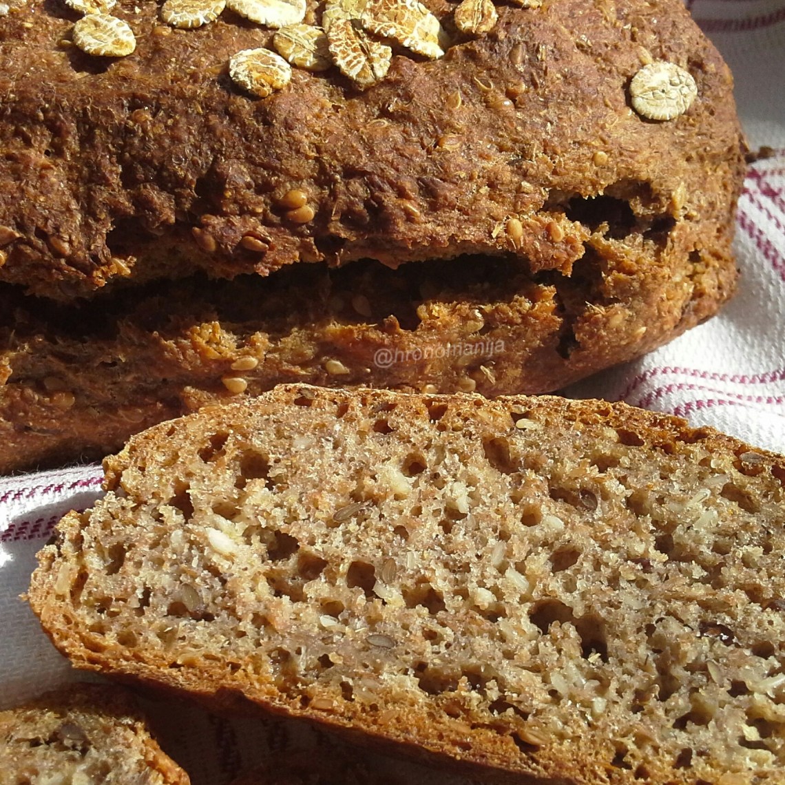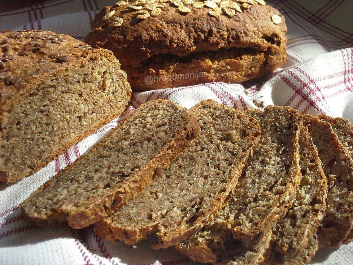 75g ražanog brašna, 50g speltinog brašna, 25g ječmenog brašna, 150ml kisele vode, 1 kašika susama, 1 kašika semena lana, 1 kašika dozvoljenog ulja, morska so i kašičica praška za pecivo.
